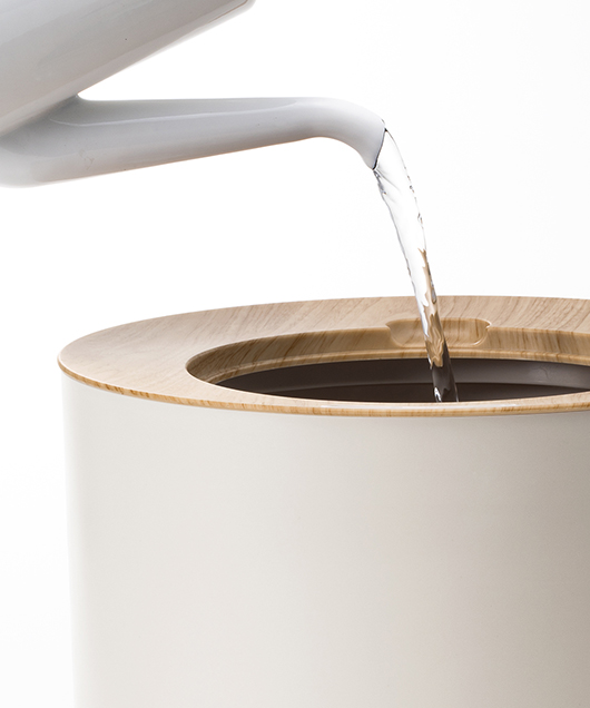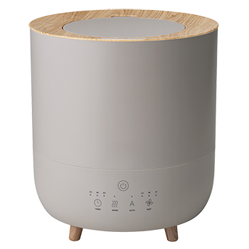 オブジェのようなコロンとしたフォルムと木目調のバイカラーデザインがナチュラルモダンな雰囲気を演出してくれる上部給水式のハイブリッド加湿器「フォグミスト」。操作パネルはタッチセンサーを搭載したシンプルなデザインで、アクセントとして取り入れられている木目調のデザインがお部屋の家具とも合わせやすく、インテリアとの相性もぴったり。自動運転モードも搭載しているので、お部屋の湿度に応じて自動で加湿量が切り替わり、常に快適な湿度を保ちます。アロマ対応で心地よい香りとともに加湿します。