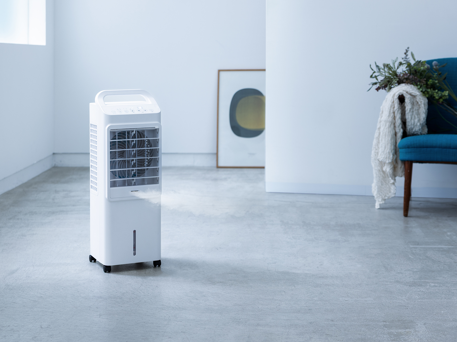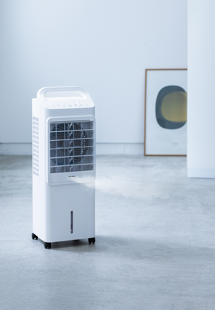 微細なミストを含んだ風で潤いのある涼しさを届ける「ミストクールファン」と、気化熱で自然な涼風を生み出す「エアクールファン」。自然でやさしい涼風を届け、エアコンの強い冷風が苦手な方でも心地よくお使いいただけます。気化熱を利用した省エネ設計に加え、高性能DCモーターで静音性と効率的な風量調整を実現。さらに左右自動ルーバーを搭載しているため、風を広範囲にムラなく届けます。ハンドルとキャスター付きで簡単に移動でき、離れた場所からのリモコン操作も可能なコンパクト冷風扇です。